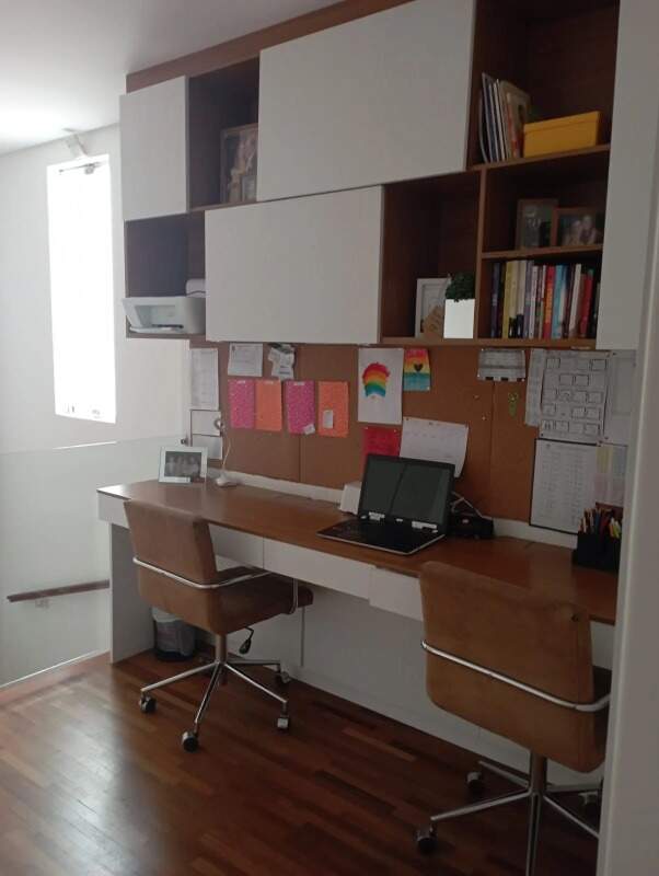Sala ampla integrada a um charmoso escritório e lavabo;