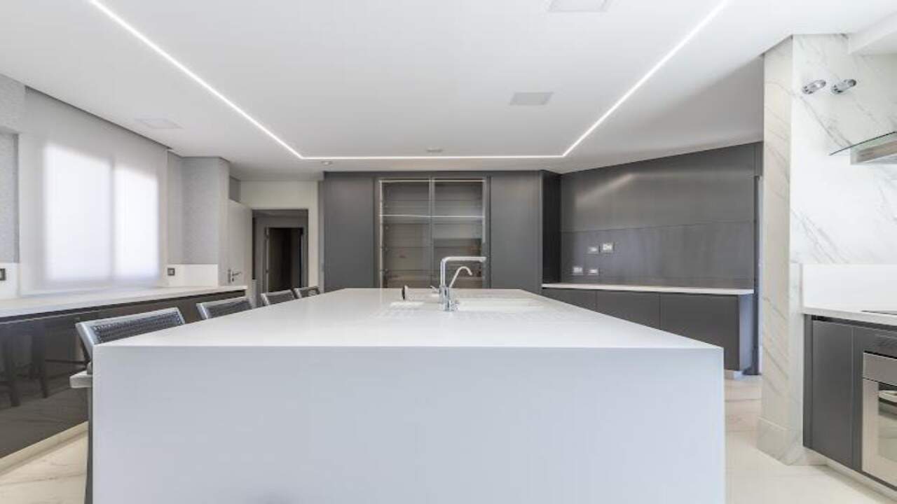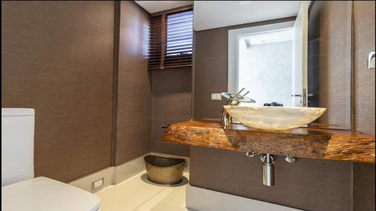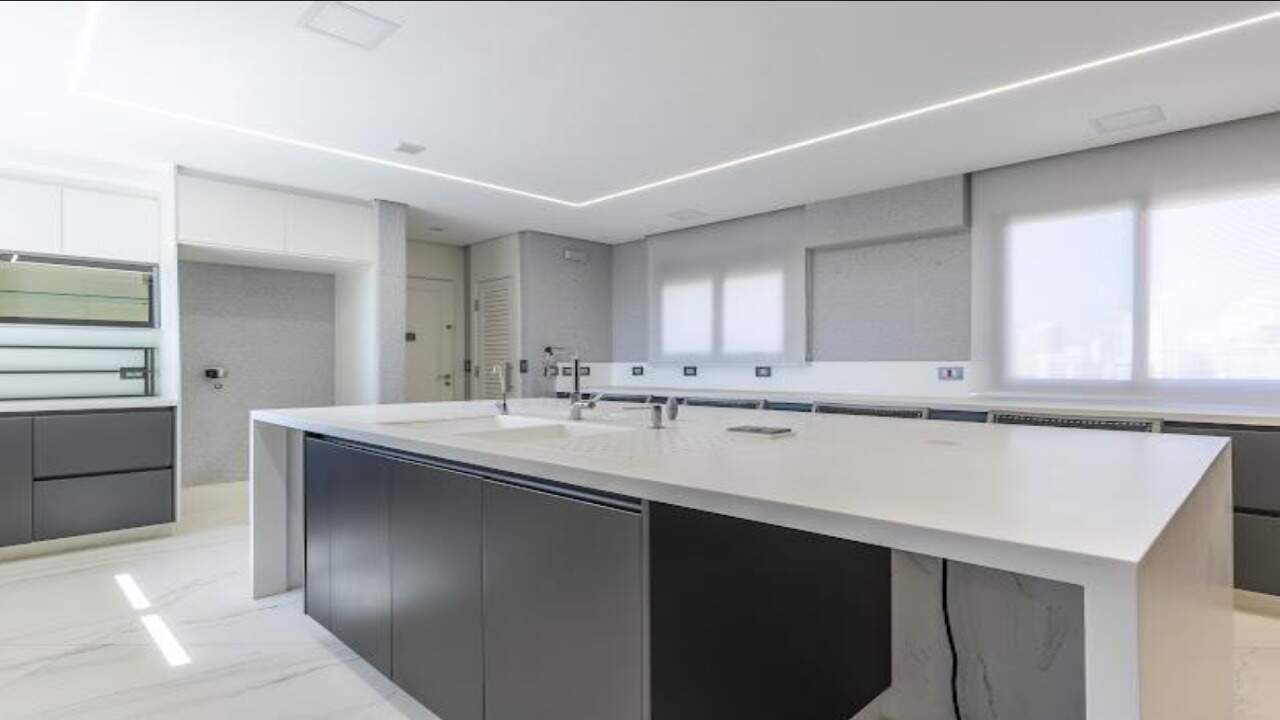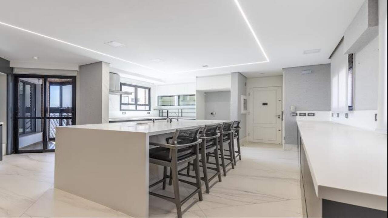 O imóvel conta com 4 dormitórios, sendo 2 suítes, além de um closet espaçoso, banheira, e lavabo. A sala ampla, com ar-condicionado central, se integra à cozinha moderna com ilha e armários planejados de alto padrão. A lavanderia é funcional e bem equipada, com dependência de serviço com quarto e banheiro.